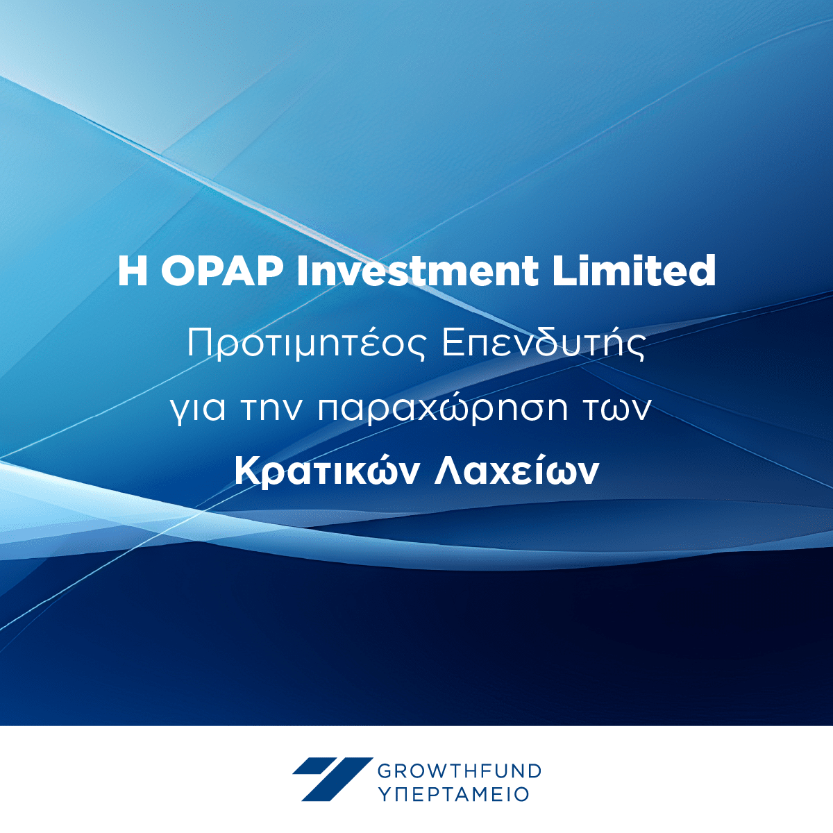 Το Υπερταμείο/Growthfund ανακοινώνει την ανακήρυξη της εταιρείας «OPAP Investment Limited» ως Προτιμητέου Επενδυτή στον διαγωνισμό για την παραχώρηση του αποκλειστικού δικαιώματος παραγωγής, διαχείρισης, λειτουργίας, προβολής και εκμετάλλευσης των Κρατικών Λαχείων για 12 χρόνια.